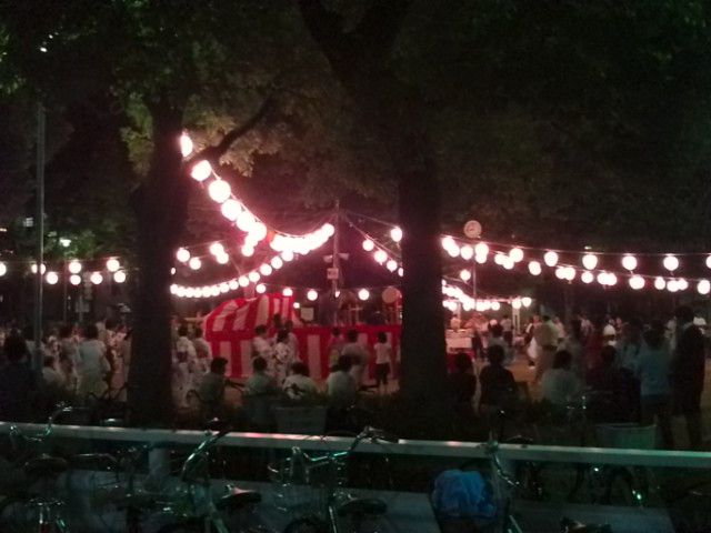先ほどから外が騒がしいと見てみれば、近くの公園で盆踊りみたいなことやってた。